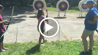 On Saturday, we started with a good breakfast of pancakes and sausage. Caitie didn't have any sausage (she doesn't like it) and dad didn't have any pancakes (they didn't make enough). After that we headed out to a variety of activities: Screen printed a t-shirt, tested hammocks, played some lawn games, made 2 candles, had hot dogs for lunch, learned archery, went canoeing, tie dyed the t-shirt that we screen printed, then made some leather crafts. That night, we ate tacos in a bag, went to the big campfire, then hung out at our camp.